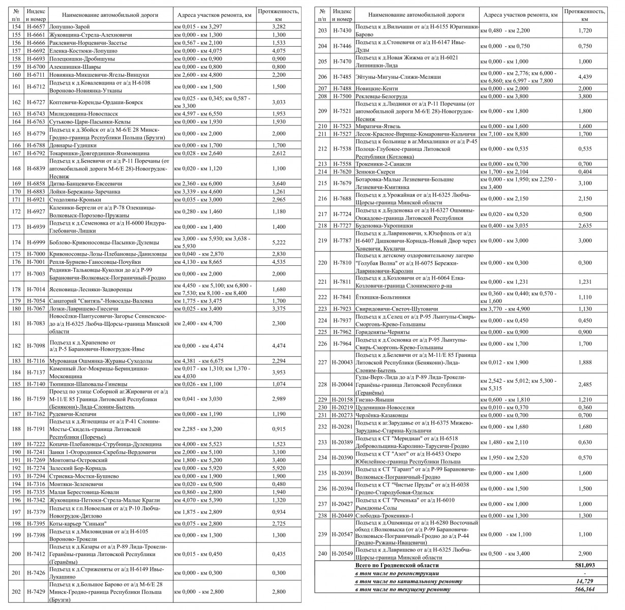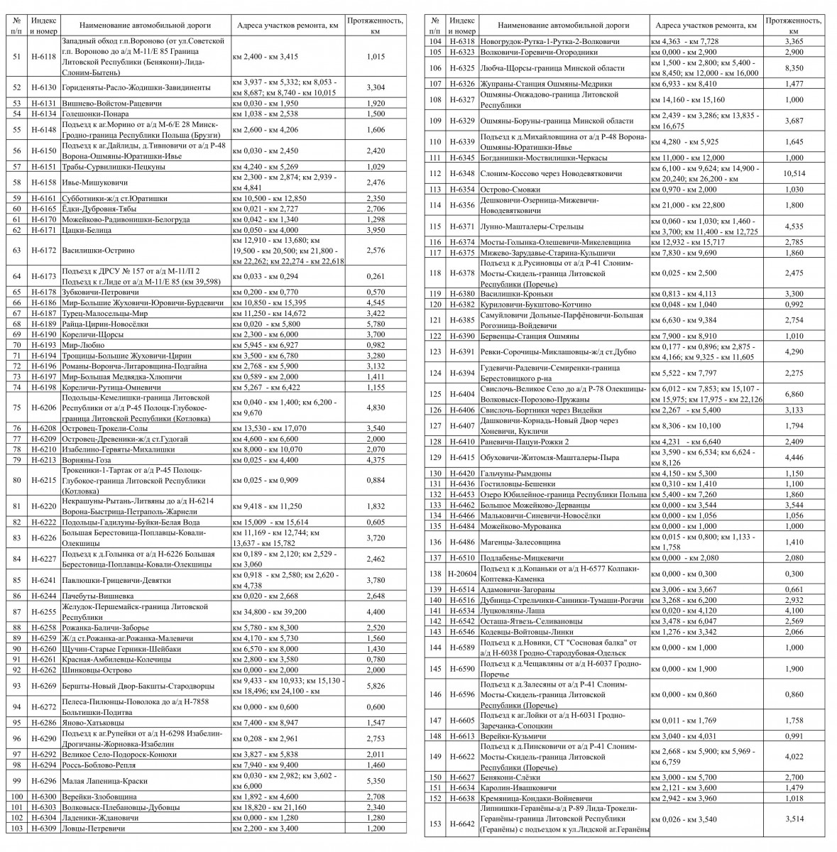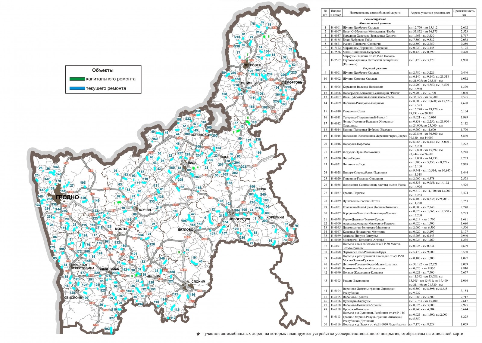 Карта-схема участков местных автомобильных дорог, планируемых к проведению дорожных работ в 2026 году по Гродненской области (включая участки устройства усовершенствованного покрытий)