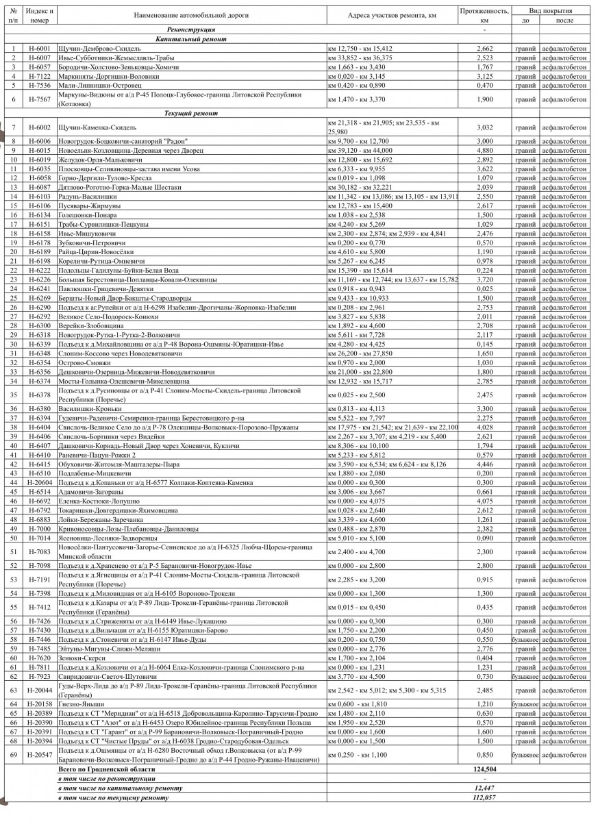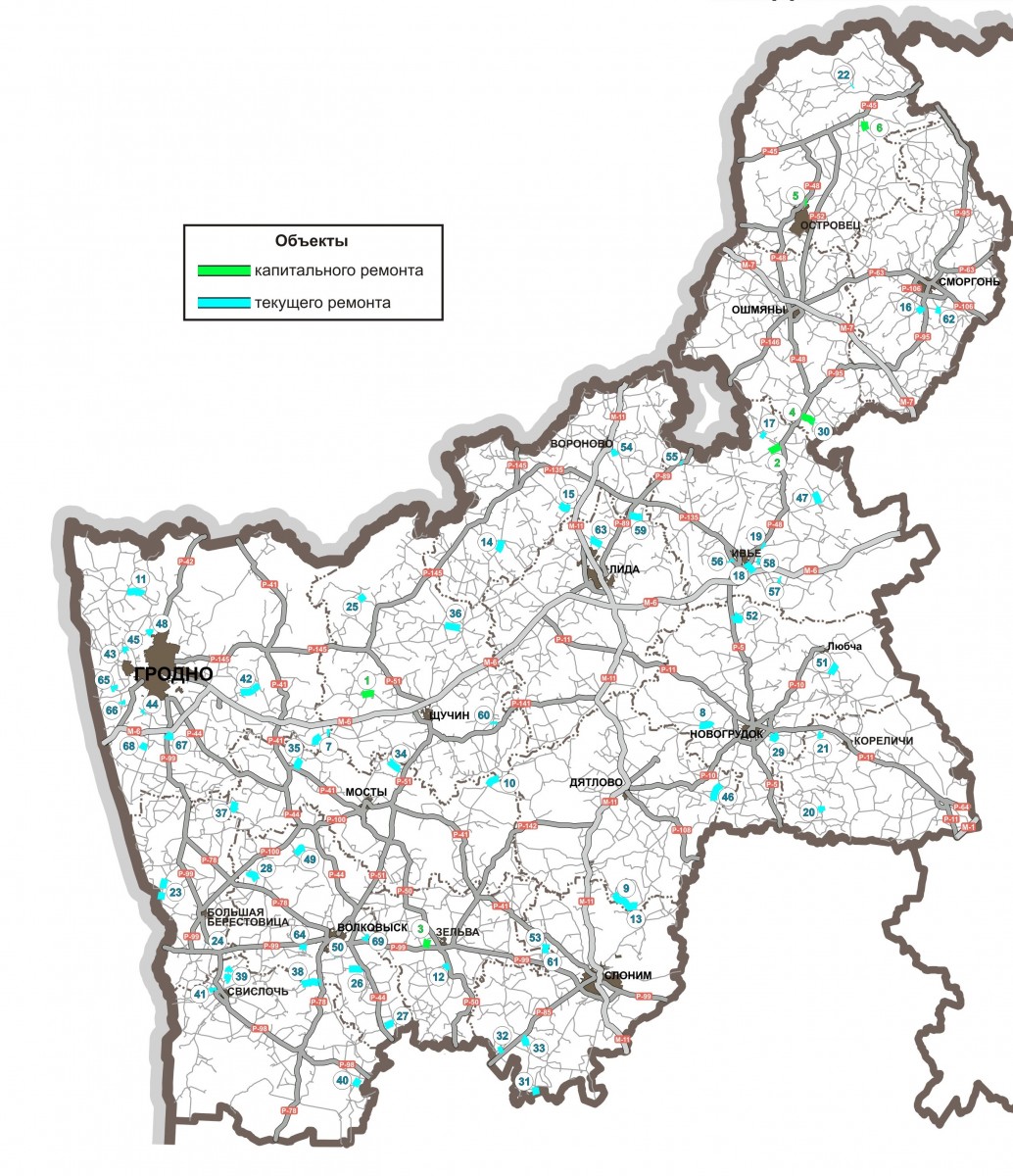 Карта-схема участков автомобильных дорог общего пользования, на который в 2026 году планируется устройство усовершенствованного покрытия по Гродненской области